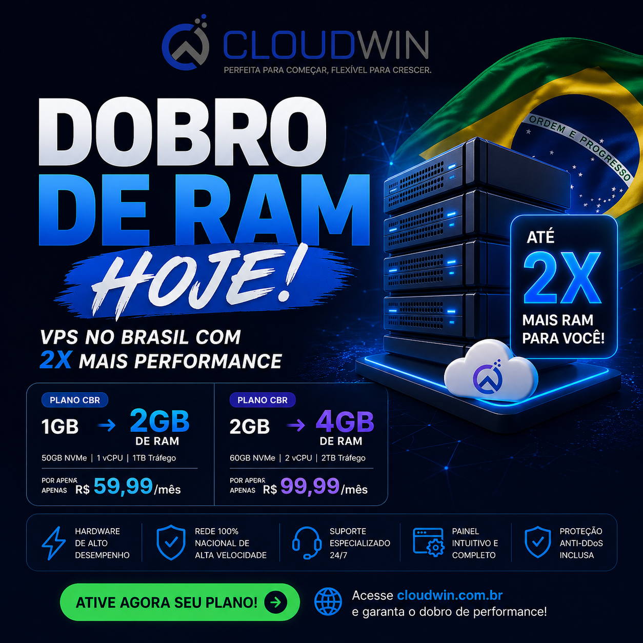 | CBR 1GB | 2x 2.6GHz+ | 1GB RAM | 50GB NVMe | Windows/Linux | R$39,99/mês | Contratar | |